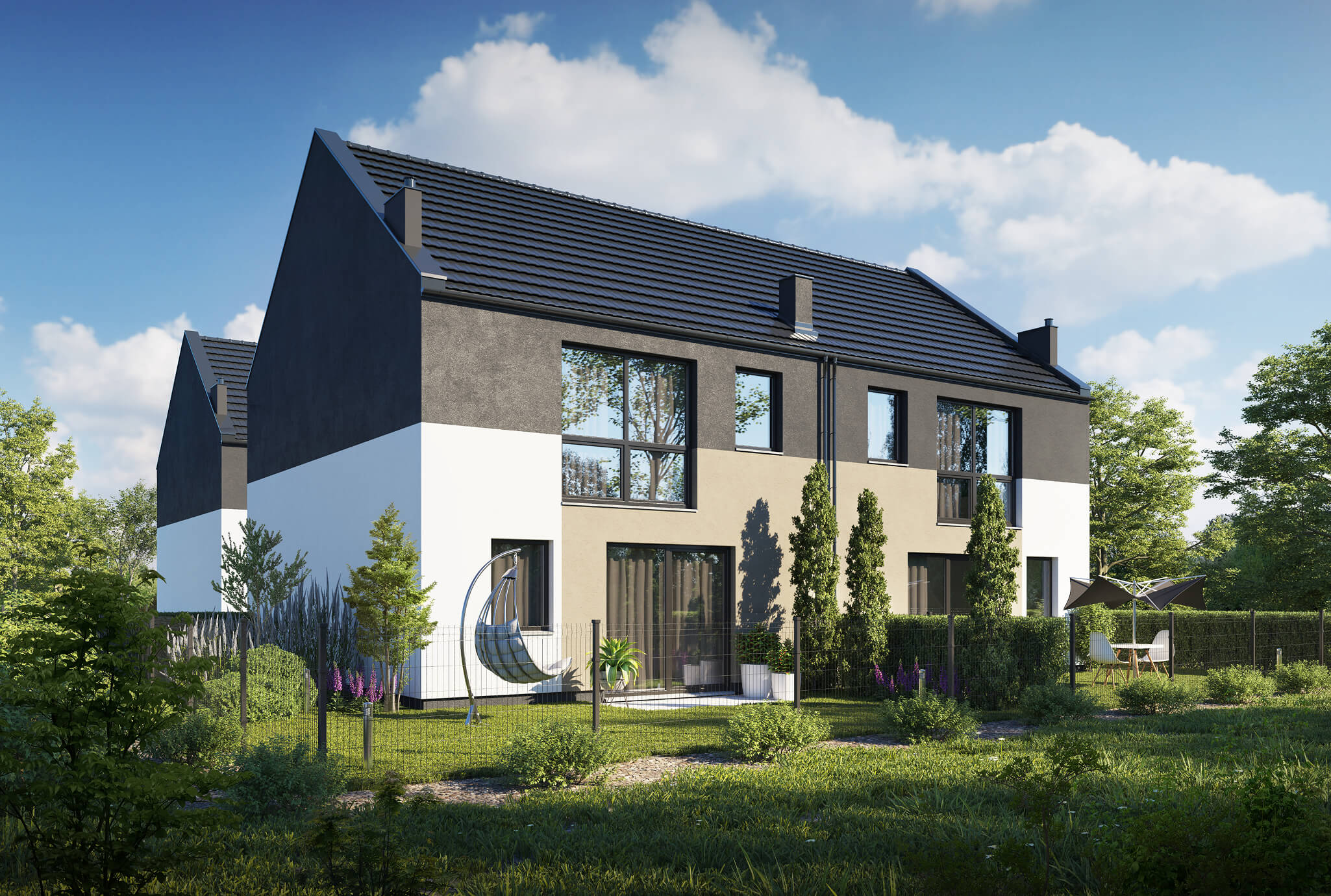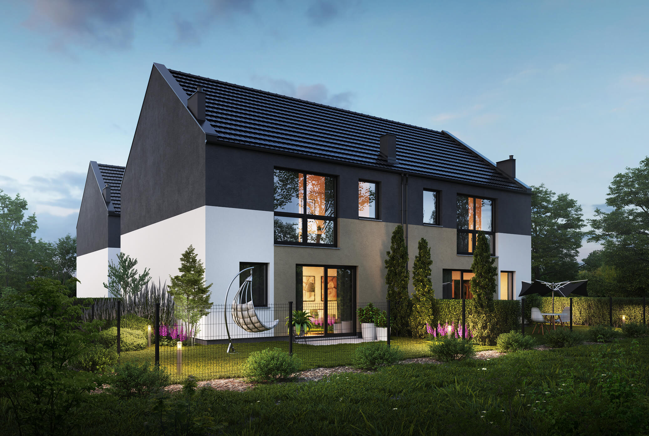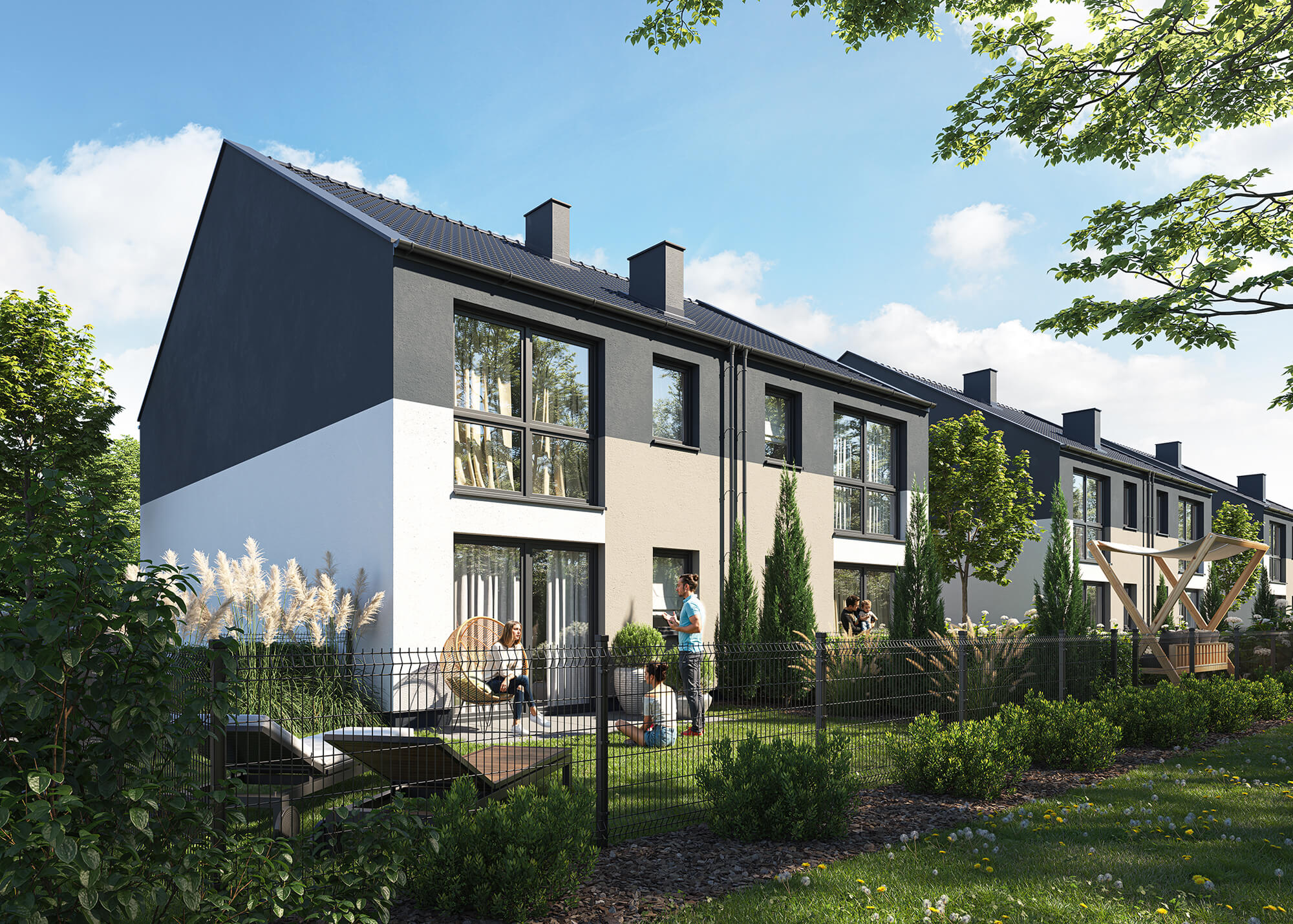 ogrodem, prywatnością oraz stylową nowoczesną architekturą. To miejsce z poczuciem intymności, gdzie w sposób szczególny spędzisz czas z rodziną i przyjaciółmi w całkowitej zgodności z naturą. Zadbaliśmy o idealną harmonię materiałów całego osiedla, tworząc kameralną niską zabudowę oraz idealne miejsce do zamieszkania, miejsce dla Ciebie.